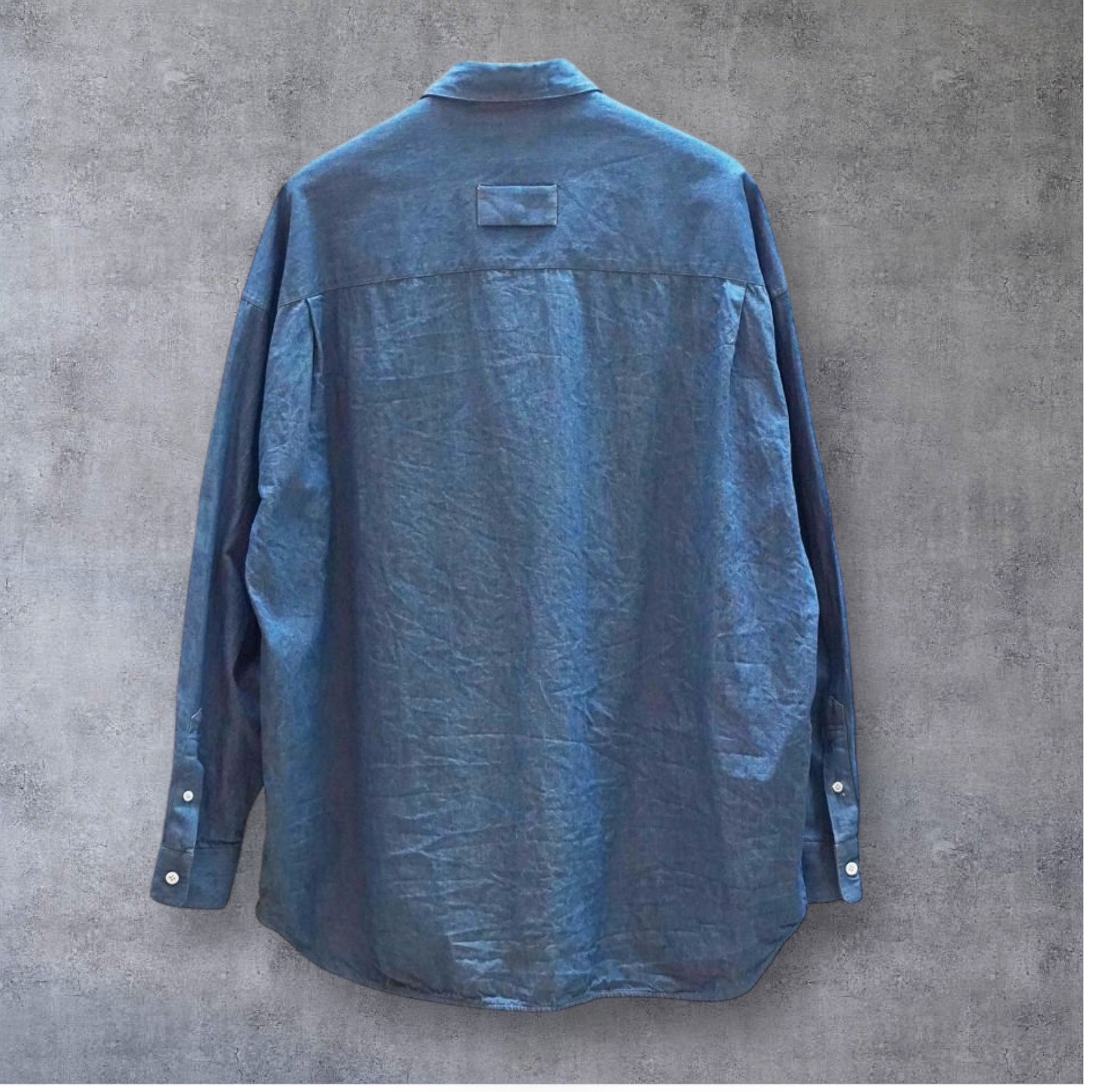 EN: Relaxed-fit shirt with a regular collar, a front chest pocket, and a subtly flared trapeze silhouette, the hem falls slightly longer, and a loop sits on the back. Crafted with fine stitching details (90/20 stitch count). The front closes with sustainable Takase shell buttons—repurposed from the food industry to reduce waste.